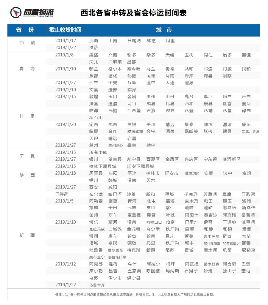 您好!2019年春节来临之际,根据《国务院办公厅公布2019年春节放假安排》,结合公司实际情况与工作安排,广州同星物流西北各线路将陆续停运,请各位客户提前做好发货安排。如有特殊情况请联系我司协商解决,如给您带来不便敬请谅解。另附上广州同星物流西北各省中转及省会停运时间表如下: